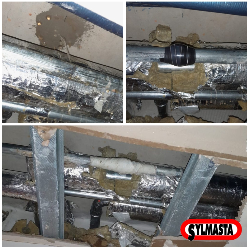An energy company are able to make a rapid live leak repair to a district heating system pipe in the ceiling cavity of a building thanks to equipping all their vans with a SylWrap Pipe Repair Contractor Case. The 50mm steel pipe developed a pinhole through which pressurised water was escaping, causing damage to surrounding surfaces.