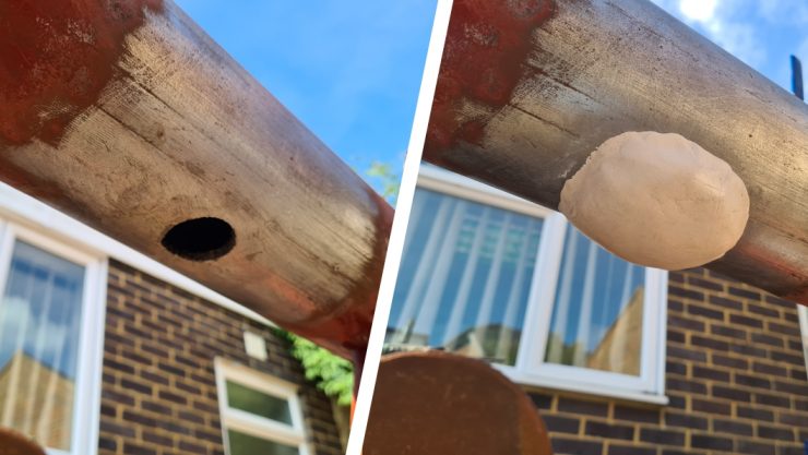 The putty was mixed by hand and formed into a disc around 75mm in diameter, ensuring total coverage of the leak. It was placed over the hole and pushed firmly down onto the pipe for maximum contact.
